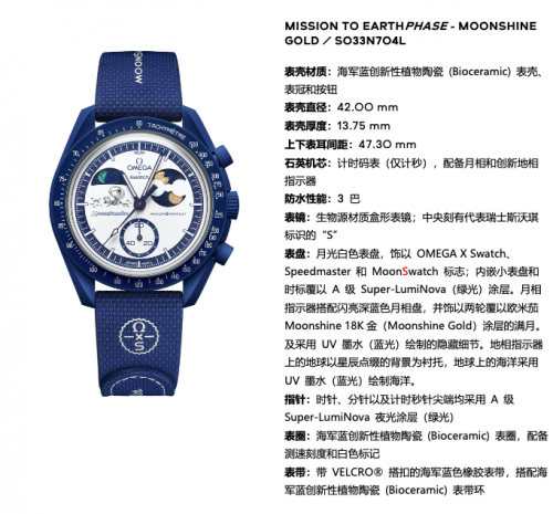 与 Bioceramic MoonSwatch 系列所有款式一致,这款 MISSION TO EARTHPHASE – MOONSHINE GOLD 腕表采用斯沃琪专利研发的创新性植物陶瓷 (Bioceramic) 材质,这种材料由陶瓷和萃取自蓖麻油的生物源材质混合制成,并呈现独特的海军蓝色调。